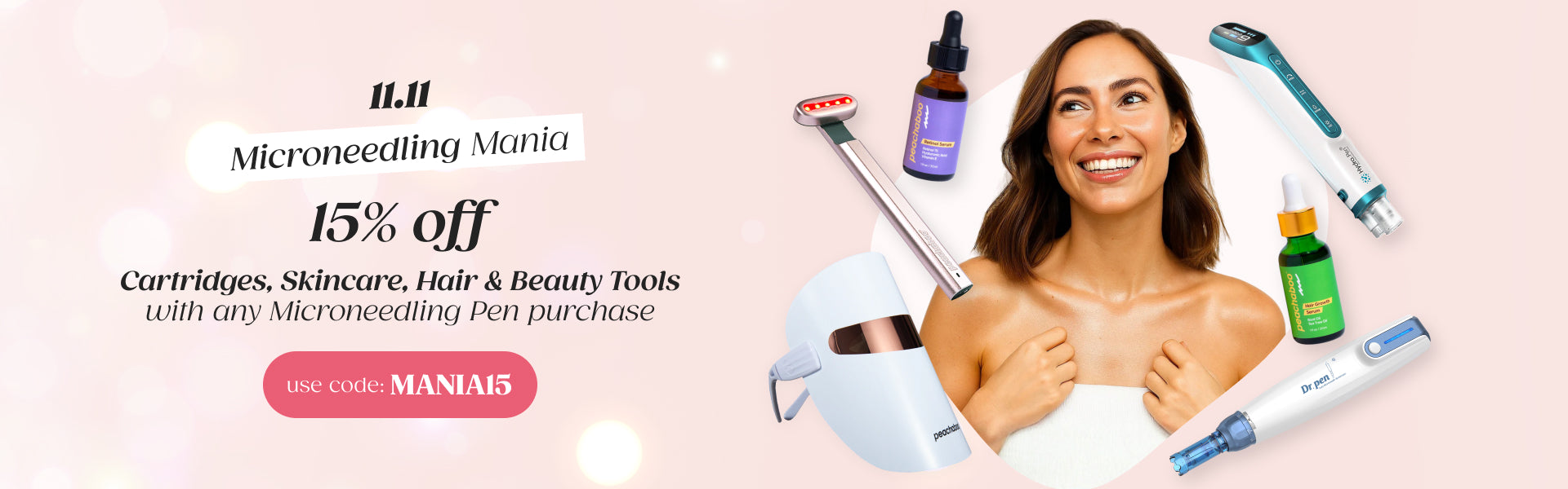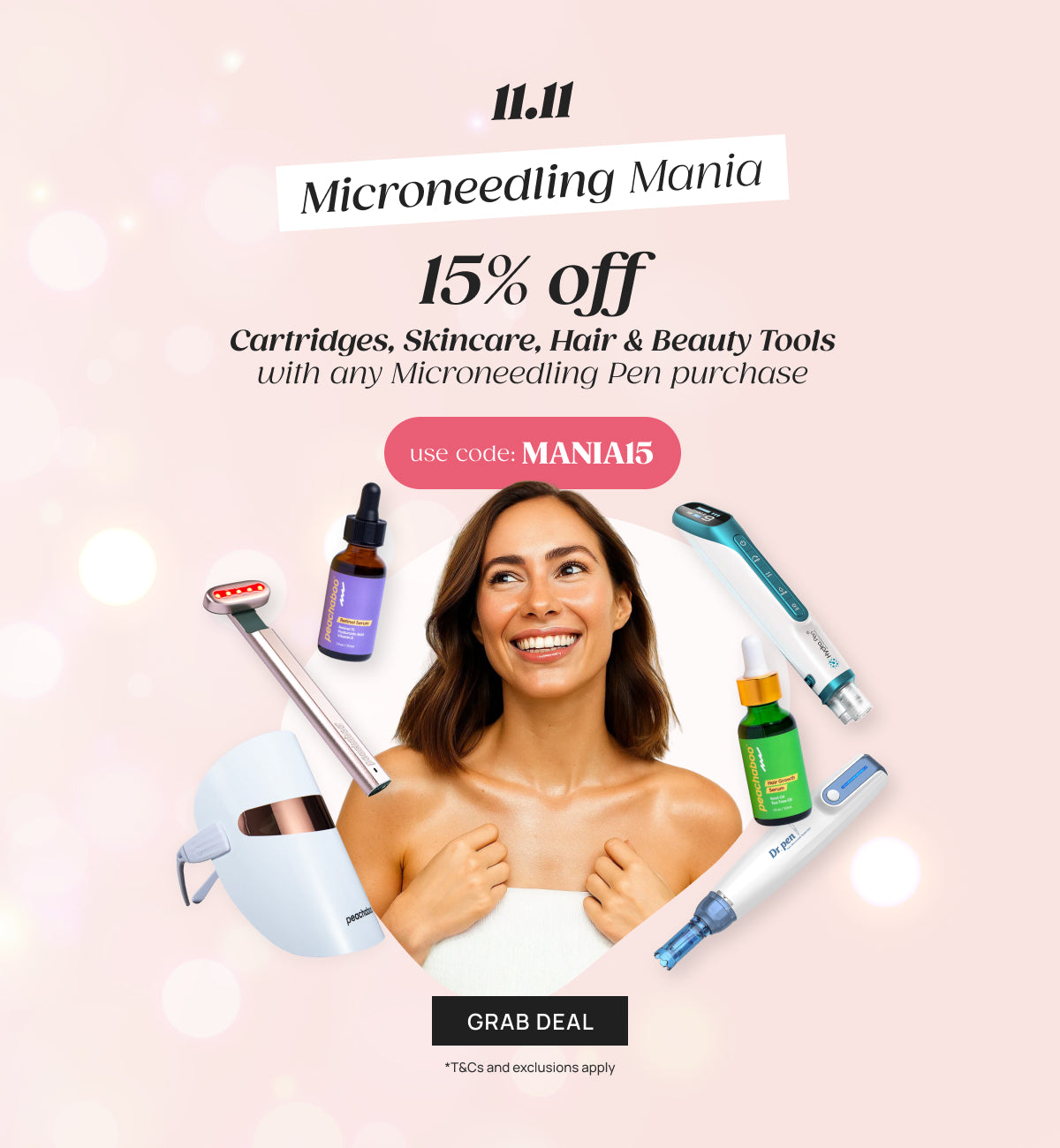 Each Dr Pen device has a cartridge with tiny needles attached. When you turn your device on and place it the area you wish to treat, the cartridge needles will pulsate and glide along the skin to penetrate the upper layers of your skin to create deliberate trauma and micro-wounds. These wounds trigger a healing response from the body, which responds by producing collagen and elastin fibers. Over time, the skin becomes rejuvenated and reduces the appearance of fine lines, scarring, hyperpigmentation, loose skin and will brighten and improve your overall texture and tone. Read more about how microneedling works here.